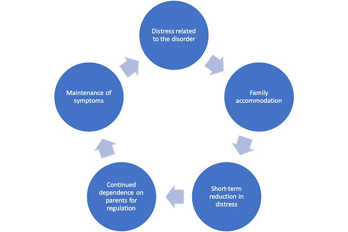 In sessions the therapist works with the parents to gradually reduce accommodations, while increased support.